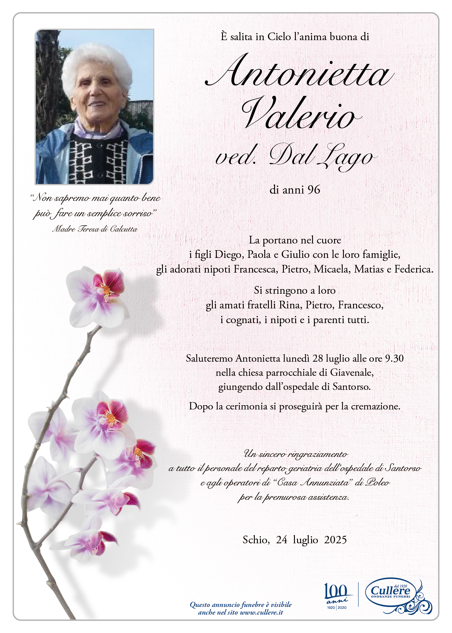 Scrivi il tuo messaggio, sarà nostra cura consegnarlo ai congiunti di Antonietta Valerio ved. Dal Lago.