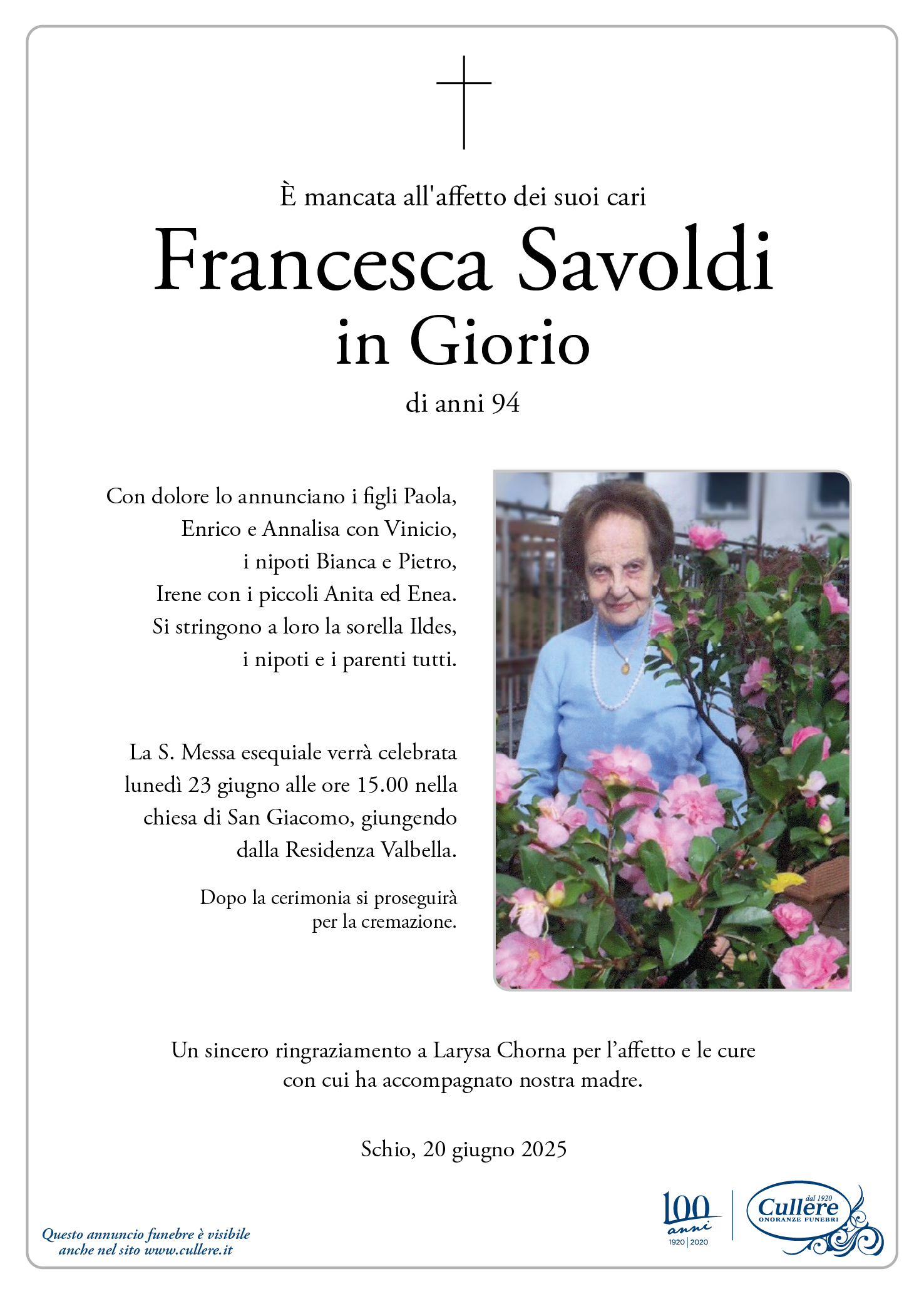 Scrivi il tuo messaggio, sarà nostra cura consegnarlo ai congiunti di Francesca Savoldi in Giorio.