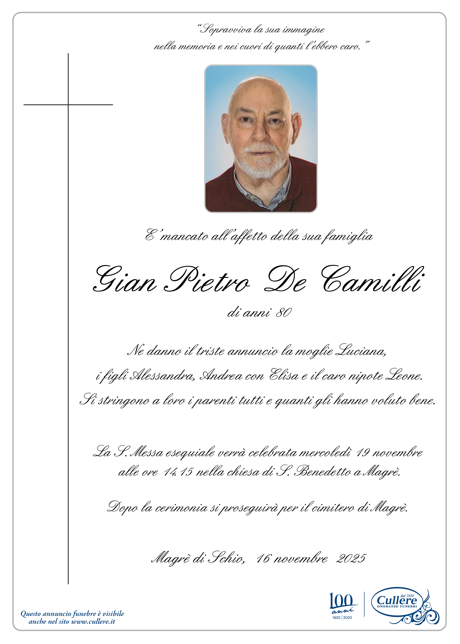 Scrivi il tuo messaggio, sarà nostra cura consegnarlo ai congiunti di Gian Pietro De Camilli.
