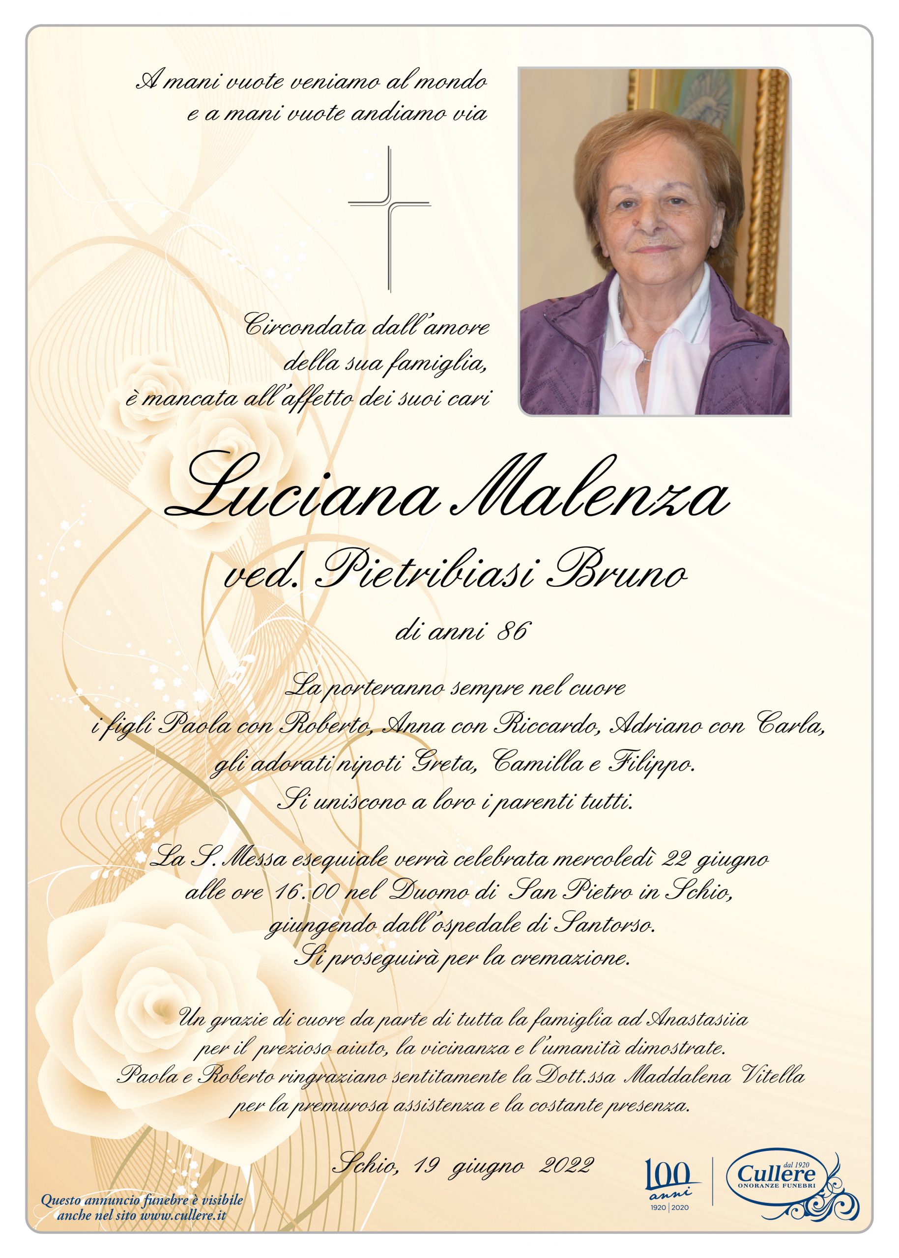 Scrivi il tuo messaggio, sarà nostra cura consegnarlo ai congiunti di Luciana Malenza ved. Pietribiasi Bruno.