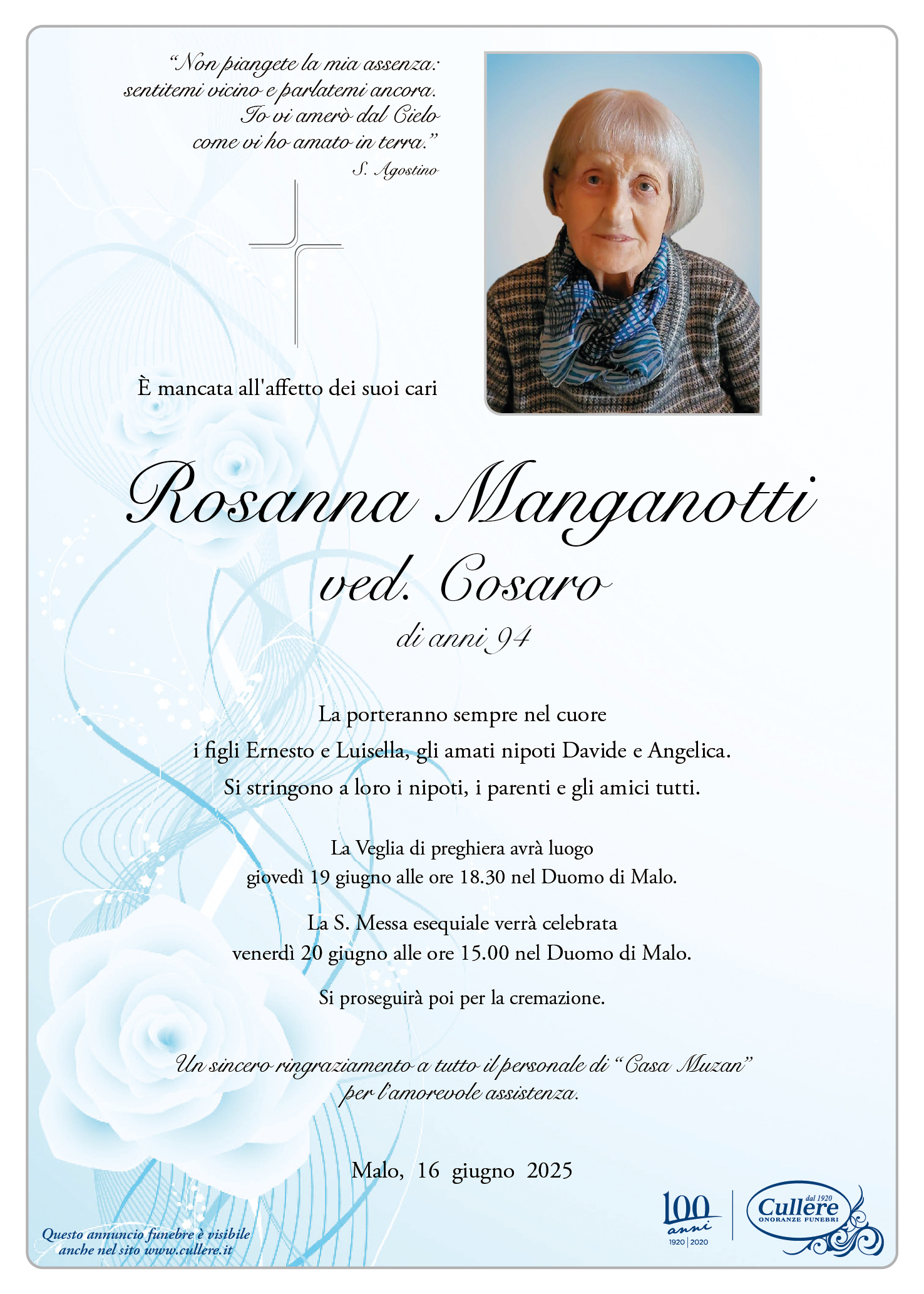 Scrivi il tuo messaggio, sarà nostra cura consegnarlo ai congiunti di Rosanna Manganotti ved. Cosaro.