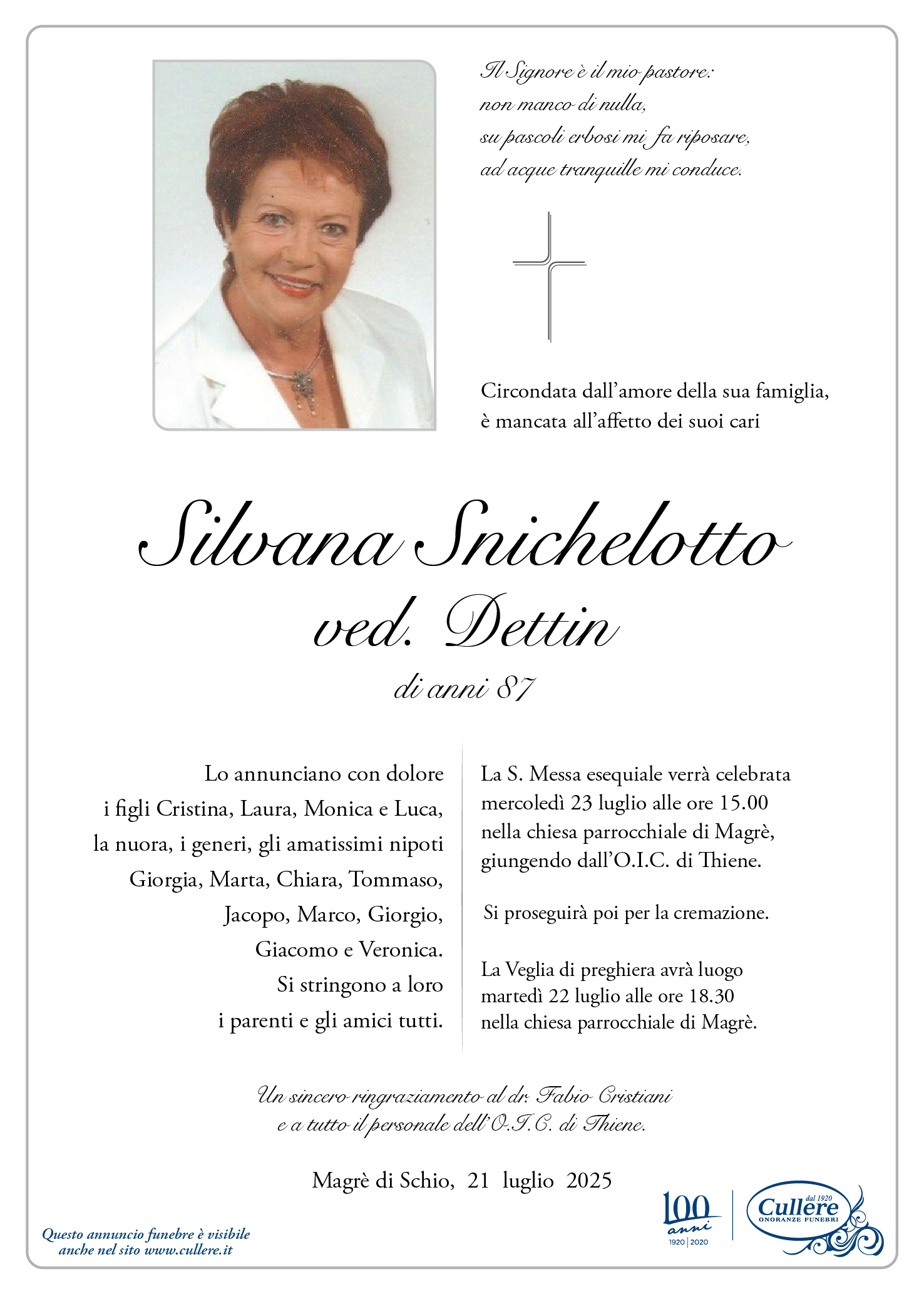 Scrivi il tuo messaggio, sarà nostra cura consegnarlo ai congiunti di Silvana Snichelotto ved. Dettin.