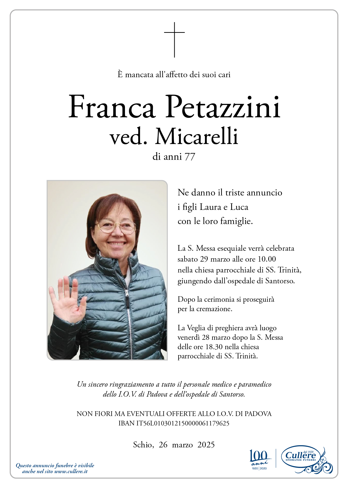 Write your message, it will be our responsibility to deliver it to any relatives of Franca Petazzini ved. Micarelli.