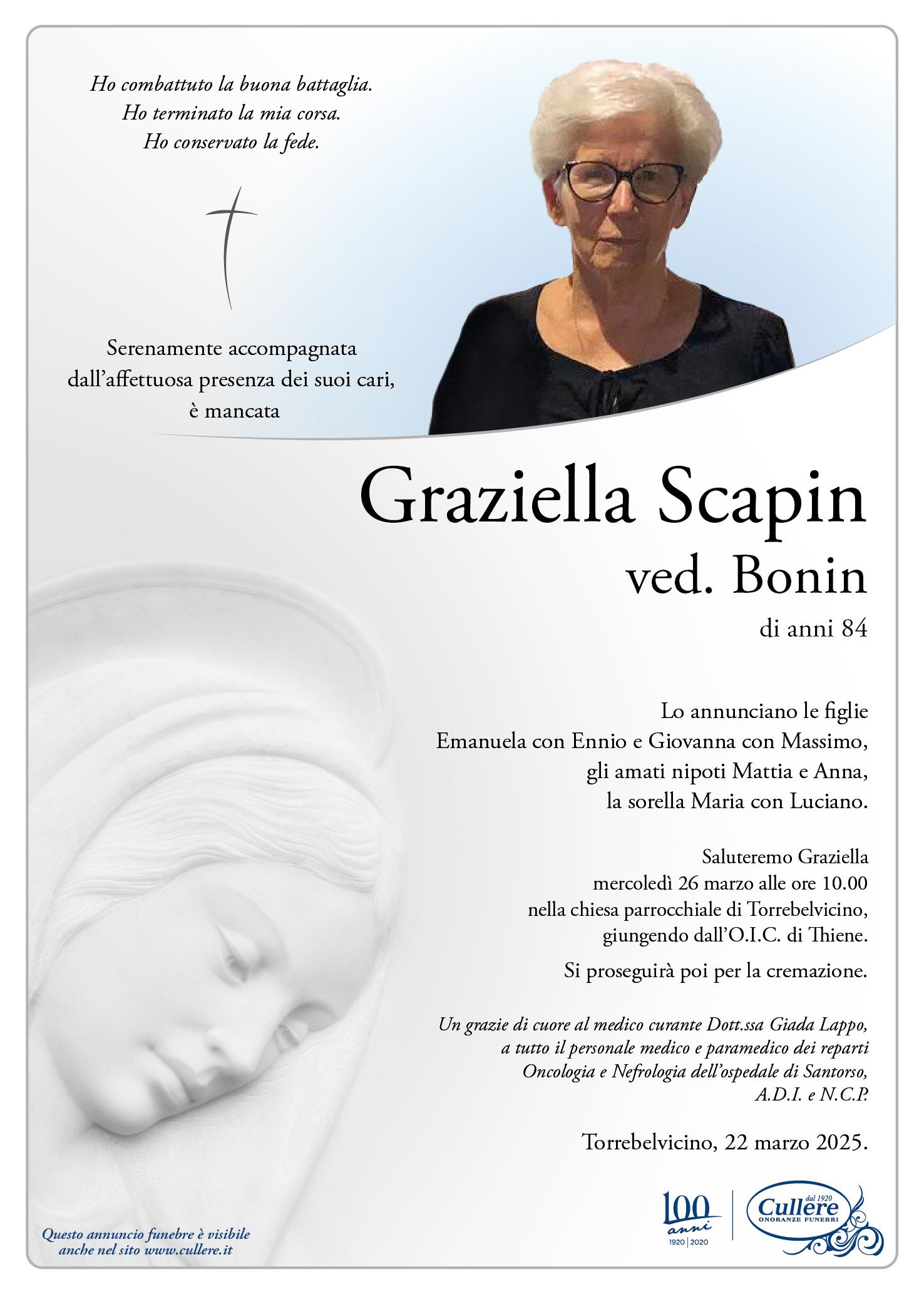 Write your message, it will be our responsibility to deliver it to any relatives of Graziella Scapin ved. Bonin.