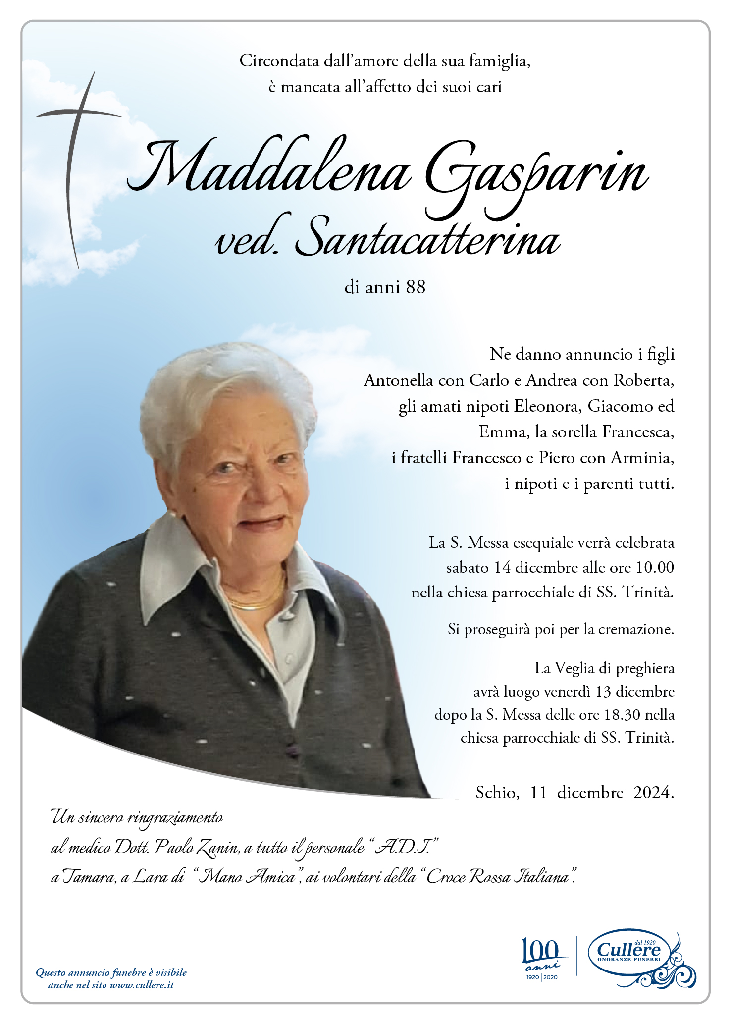Write your message, it will be our responsibility to deliver it to any relatives of Maddalena Gasparin ved. Santacatterina.